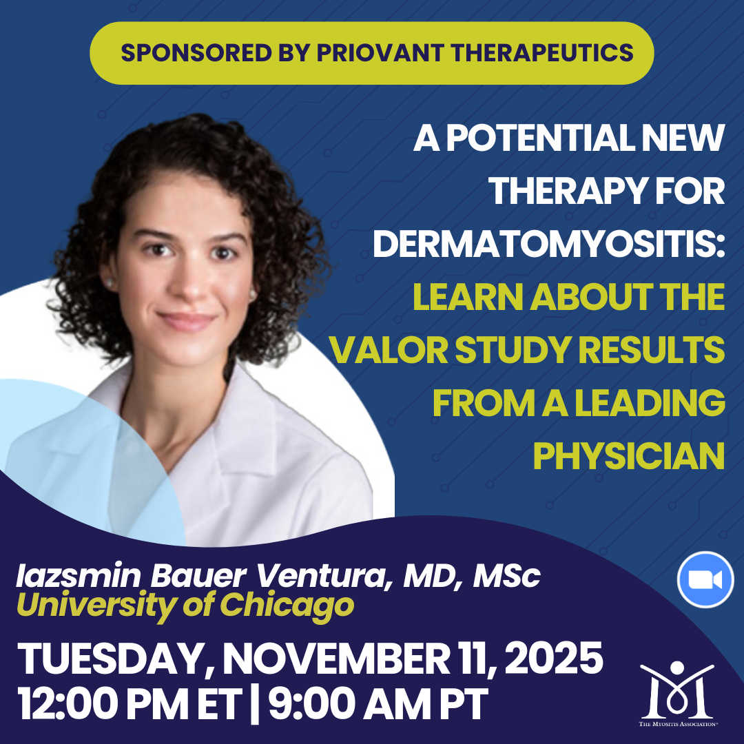 Join us for an informative webinar on the results of the VALOR study, which tested an investigational, once-daily oral medication for adults with dermatomyositis (DM) in the largest DM clinical trial ever conducted. In this 30-minute session, rheumatologist Dr. Iazsmin Ventura (University of Chicago) will review the study findings and what they could mean for patients. Participants are welcome to submit questions in advance. Thank you to Priovant Therapeutics for sponsoring this webinar!