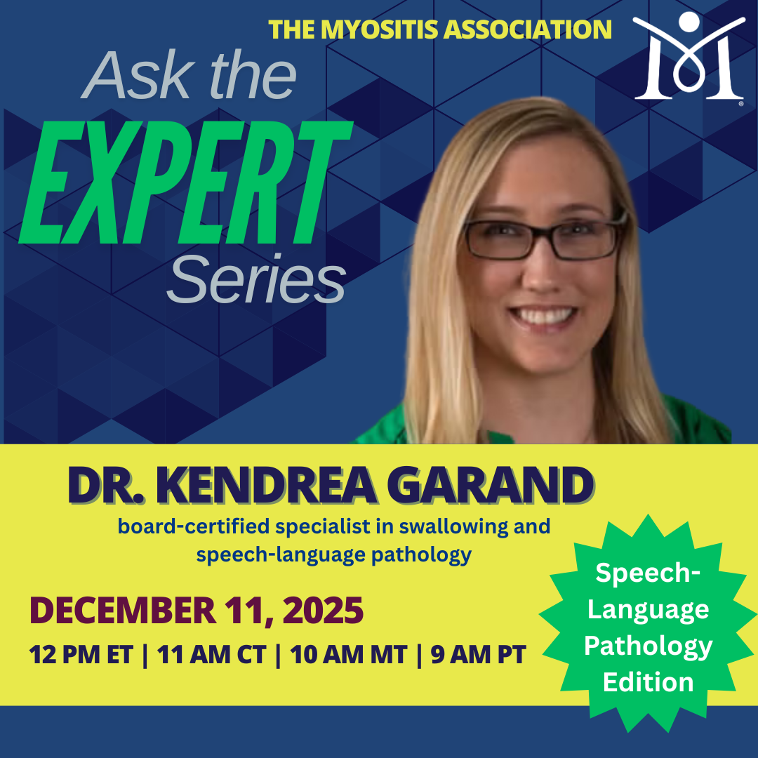 This session will focus entirely on your questions about speech, voice, and swallowing challenges in myositis—how to recognize them, when to ask for an evaluation, and practical tips that help you eat, drink, and communicate more safely and confidently.