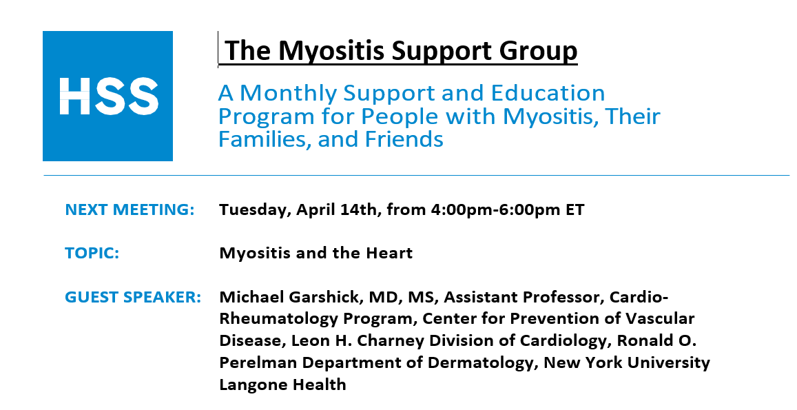 During the April 14th meeting, Dr. Michael Garshick will be presenting on Myositis and the Heart.
